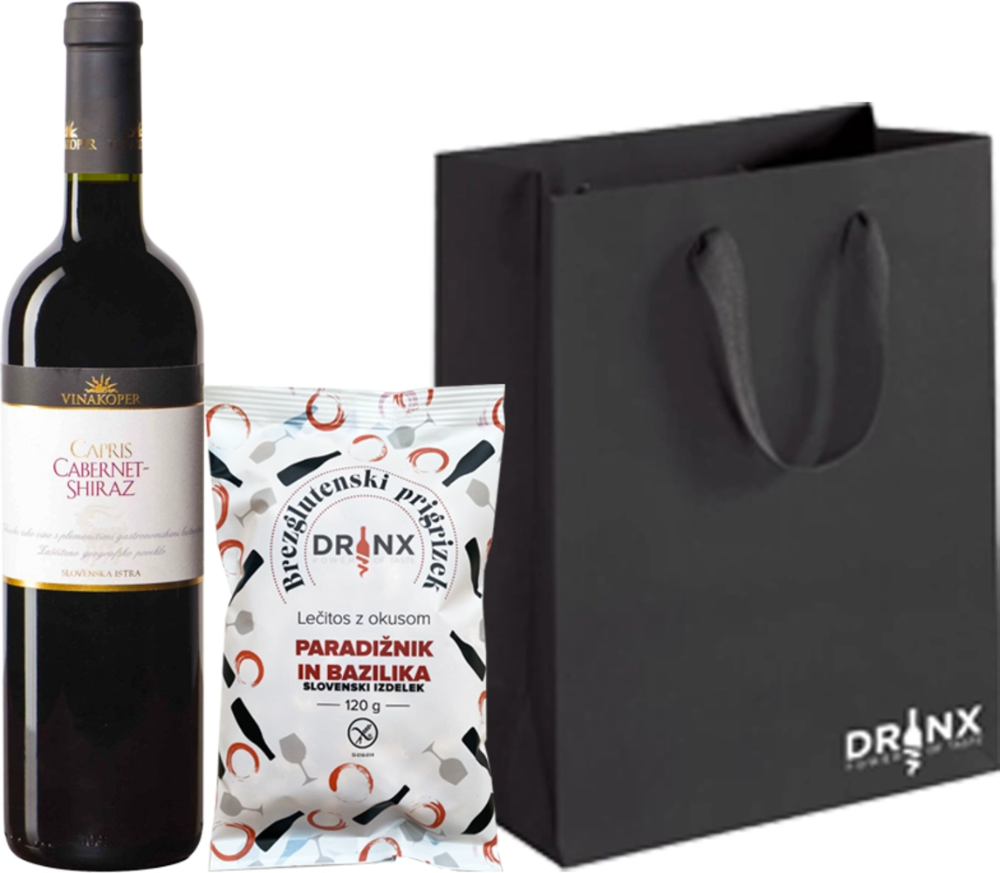 Darilni paket ponuja Capris Cabernet Shiraz Vinakoper, vino z intenzivno rubinasto barvo in aromami temnega jagodičevja, pikantnega popra in vanilje. Skupaj z Gluteno prigrizki v darilni vrečki je to odlična izbira za ljubitelje kompleksnih vin.