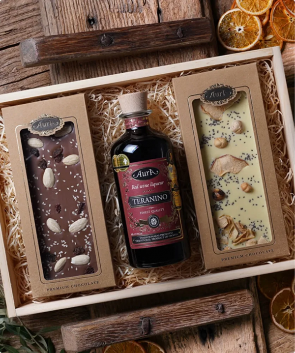 Teranino 0,5 l, premium čokolada 120 g (mlečna mešanica: rozine, mandelj, sezam), premium čokolada 120 g (bela mešanica: jabolko, lešnik, chia), lesena darilna škatla.
