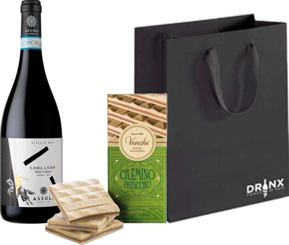 Darilni paket razkriva Lorlando BIO 2019 Assuli, ekološki Nero d’Avola, ki s svojo rubinasto rdečo barvo in bogatimi sadnimi aromami obljublja uravnotežen okus z mehkimi tanini. Doplnjen s trislojno čokolado Cremino Venchi in predstavljen v elegantni darilni vrečki, je to odlično darilo za vsakega ljubitelja močnih okusov.
