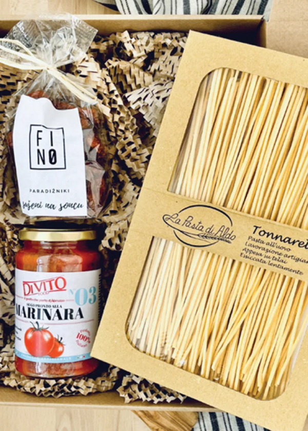V paketu najdete: • 1x BIO sušeni paradižniki iz Sicilije 100 g • 1x paradižnikova omaka iz Abruzza 350 g • 1x Jajčne testenine 250 g