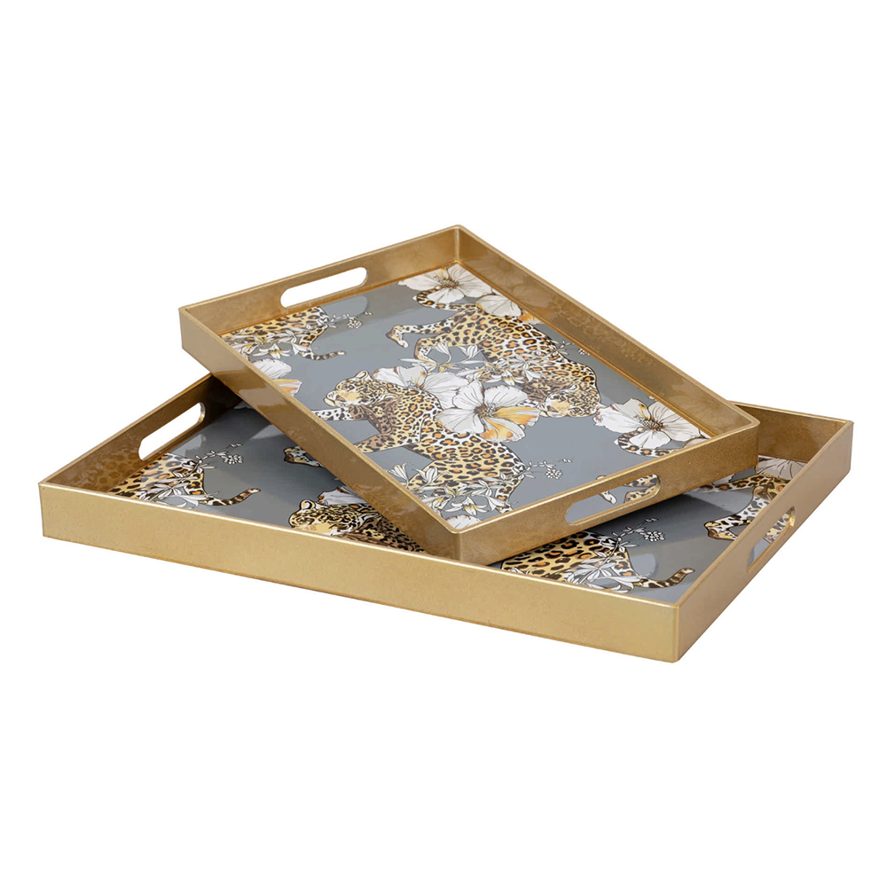 Komplet dveh elegantnih pladnjev z motivom leoparda in zlatim robom, idealen za serviranje ali kot dekorativen dodatek. večji: 48 × 35 × 4 cm, manjši: 40 × 26 × 4 cm.